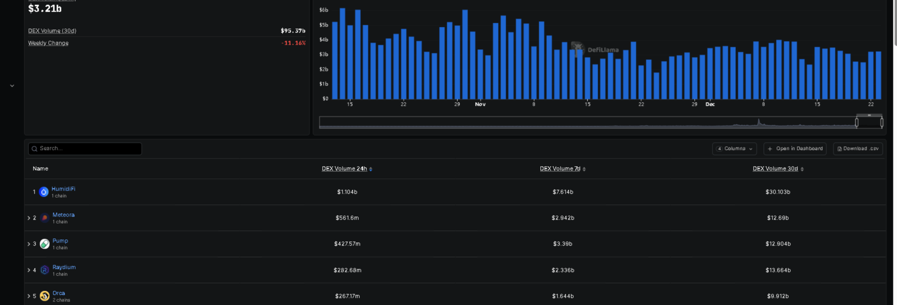 Solana DEX volume has consistently matched or surpassed that of major CEX spot volumes during the final quarter of 2025. Other data backs this trend: Raydium cleared over $100 billion in monthly volume for three months in a row, and total Solana DEX volume climbed above $120 billion in some months, keeping a multi‑month lead over Ethereum DEXes.