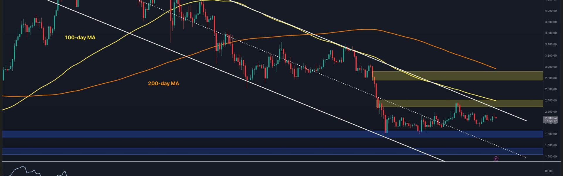 A decisive break above $2.4k would invalidate the sequence of lower highs and potentially shift the structure toward a bullish reversal, as it would also mean a break above both the descending channel’s higher boundary and the 100-day moving average. Conversely, losing the $1.8k demand zone would likely trigger a breakdown from the range and open the door for a deeper move toward the next support level at $1.6k.